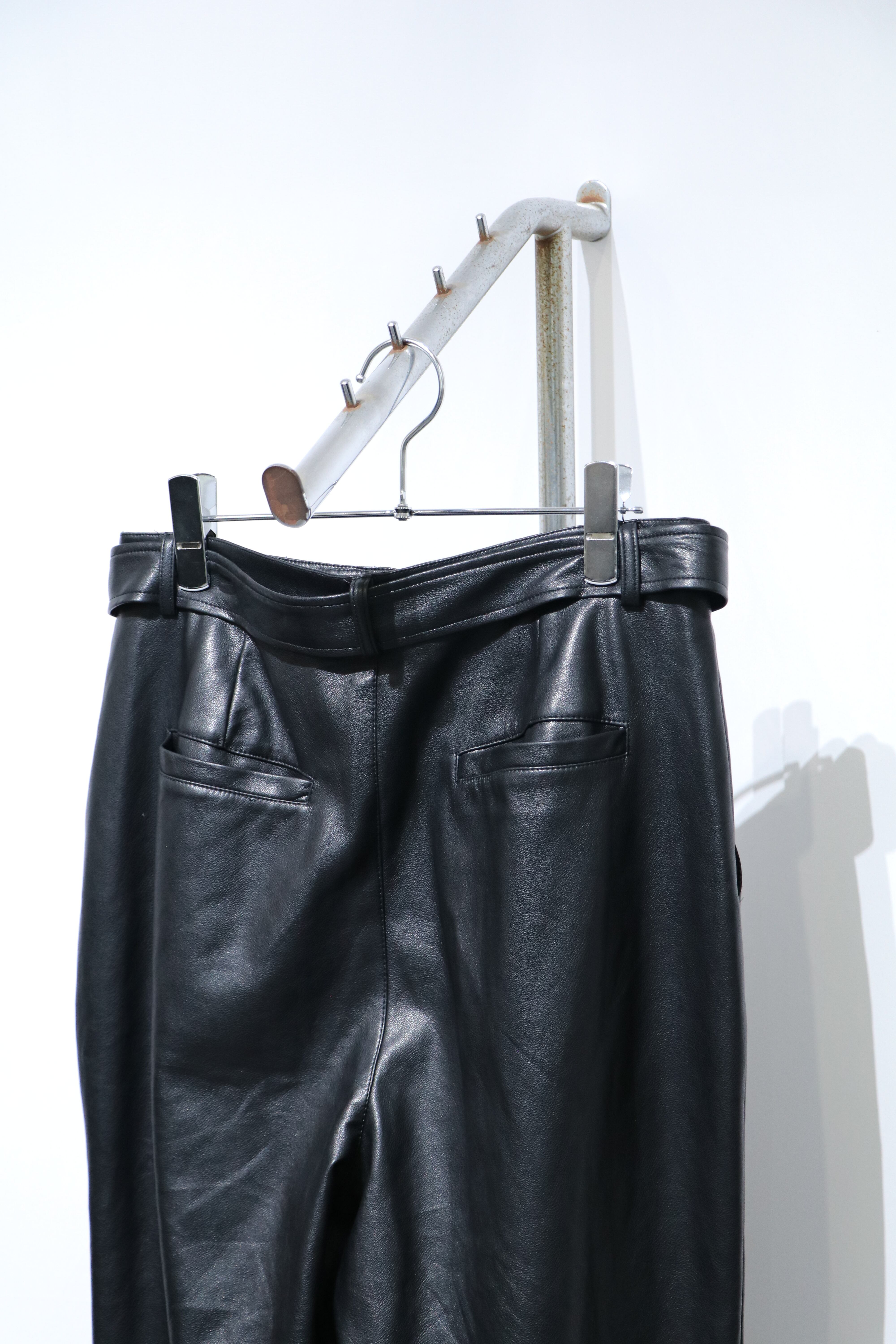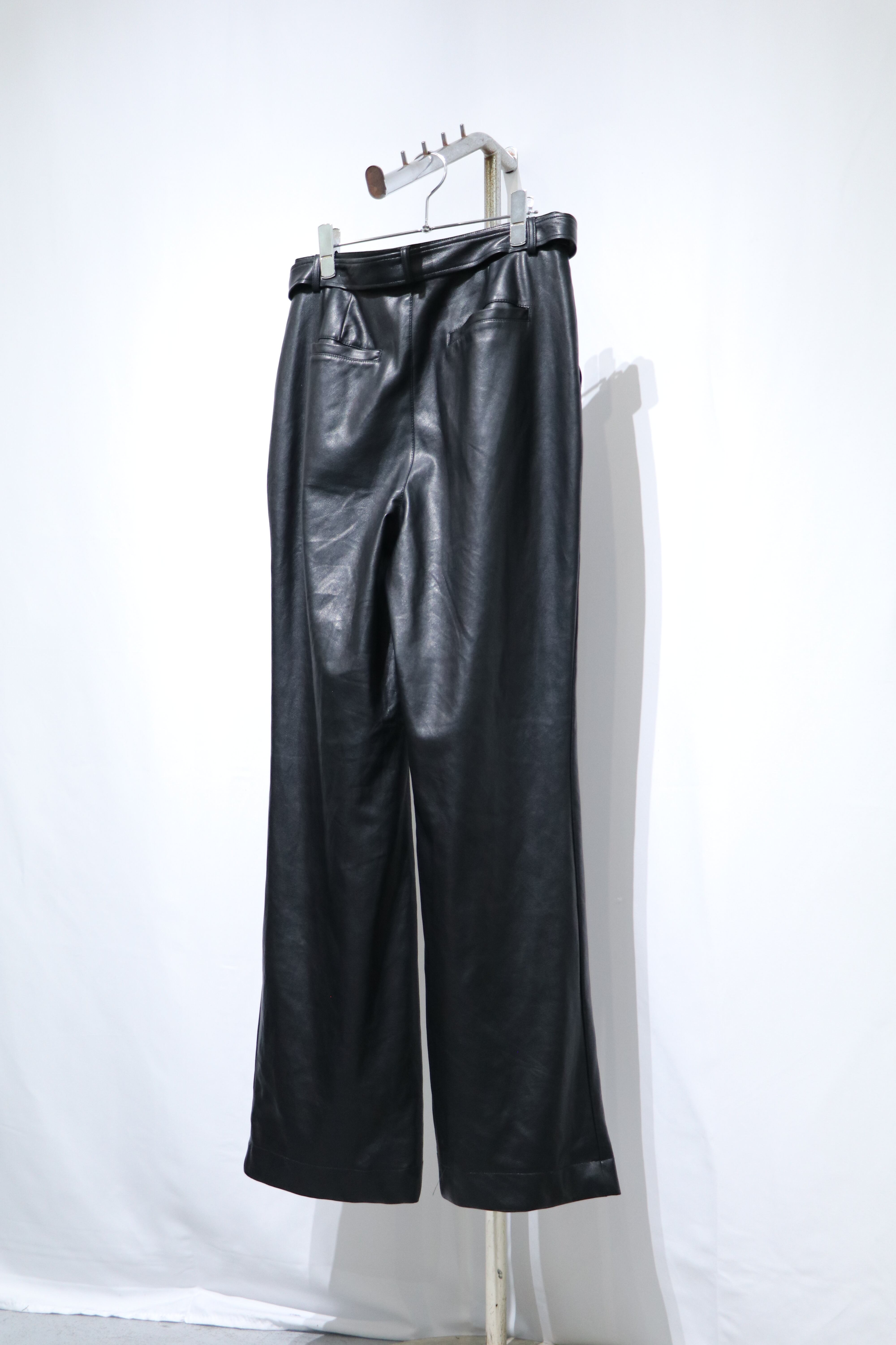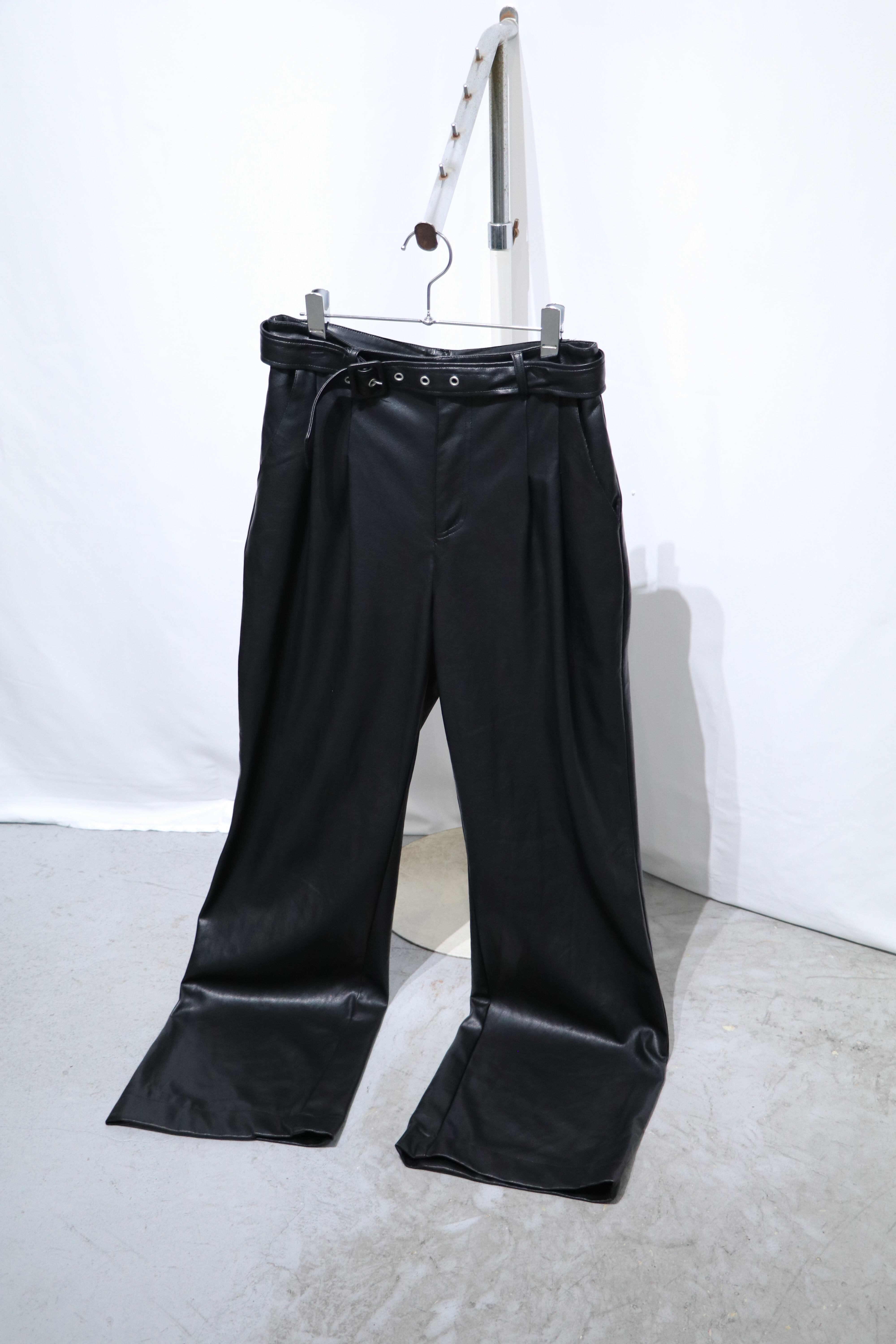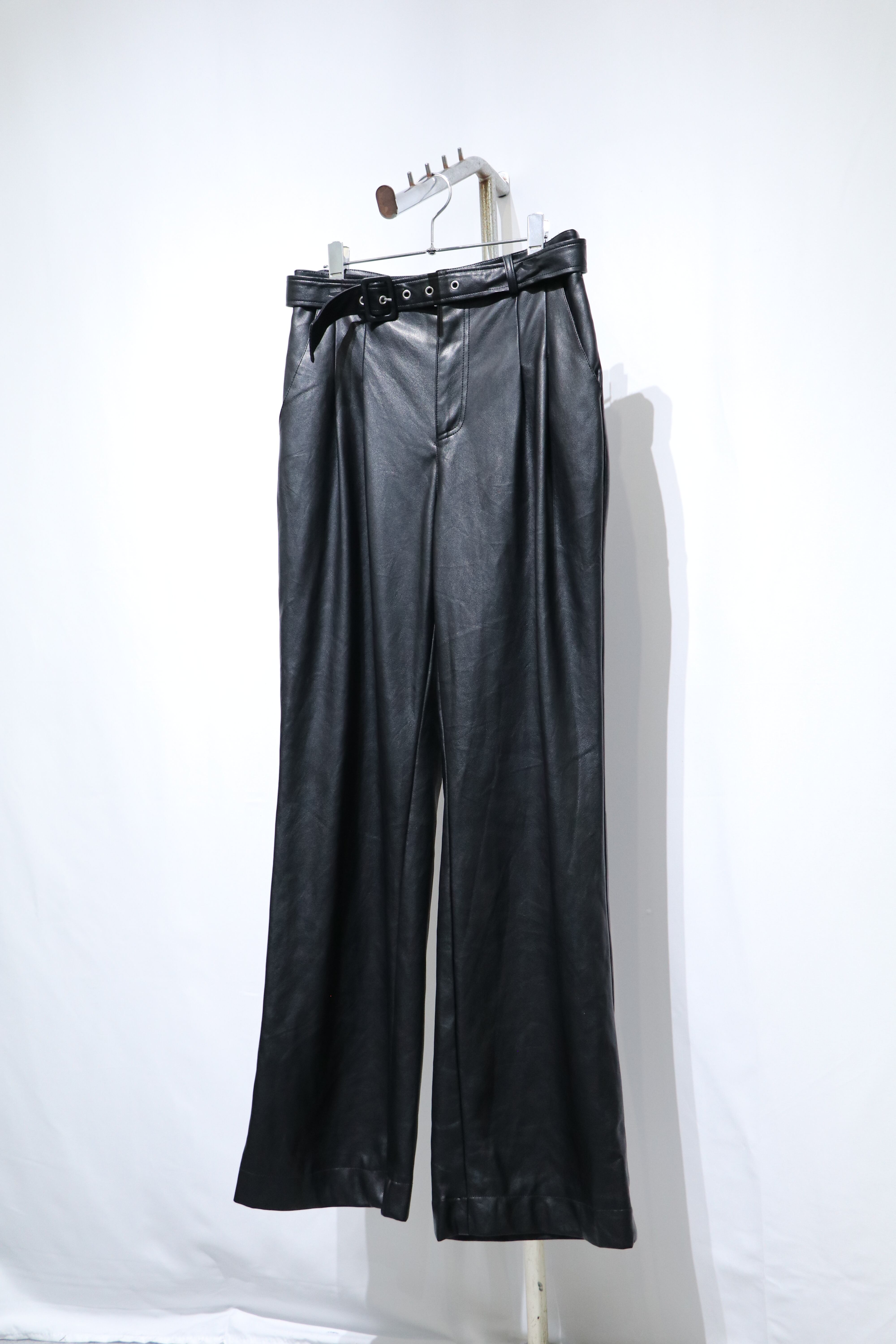 ほぼテーパードの無いズドンと落ちるシルエットが魅力的なフェイクレザーのワイドストレートパンツ。控えめな光沢感が高級感を出してくれます。ベルト付きなのも高ポイント○