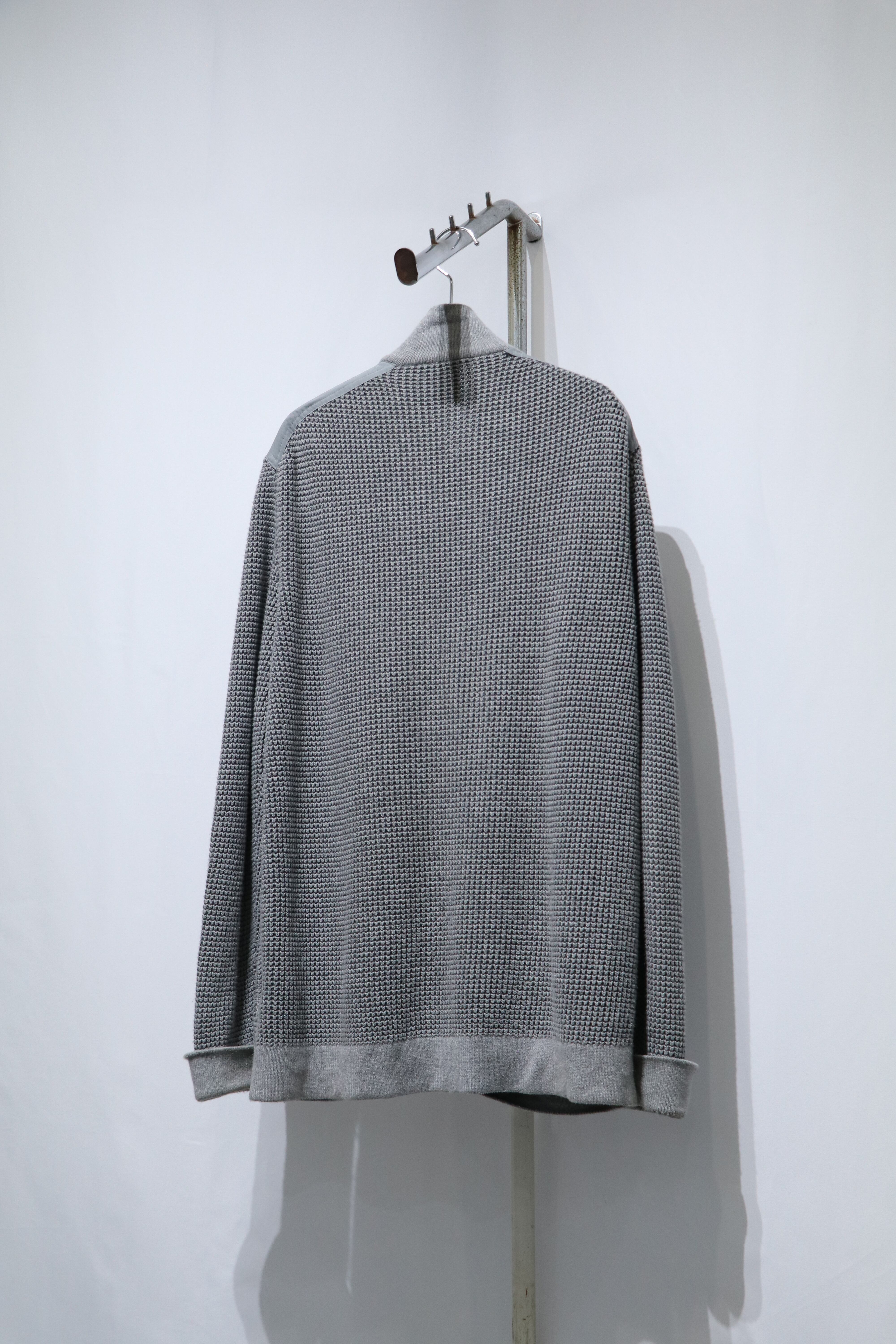 肩にはポリエステル素材の切り替え、首元・リブはボディとは異なる目の細かな編み、グレー1色ではありますが細部までこだわりの伝わる1着。シンプルだけど差別化させたい方におすすめしたいドライバーズニット○