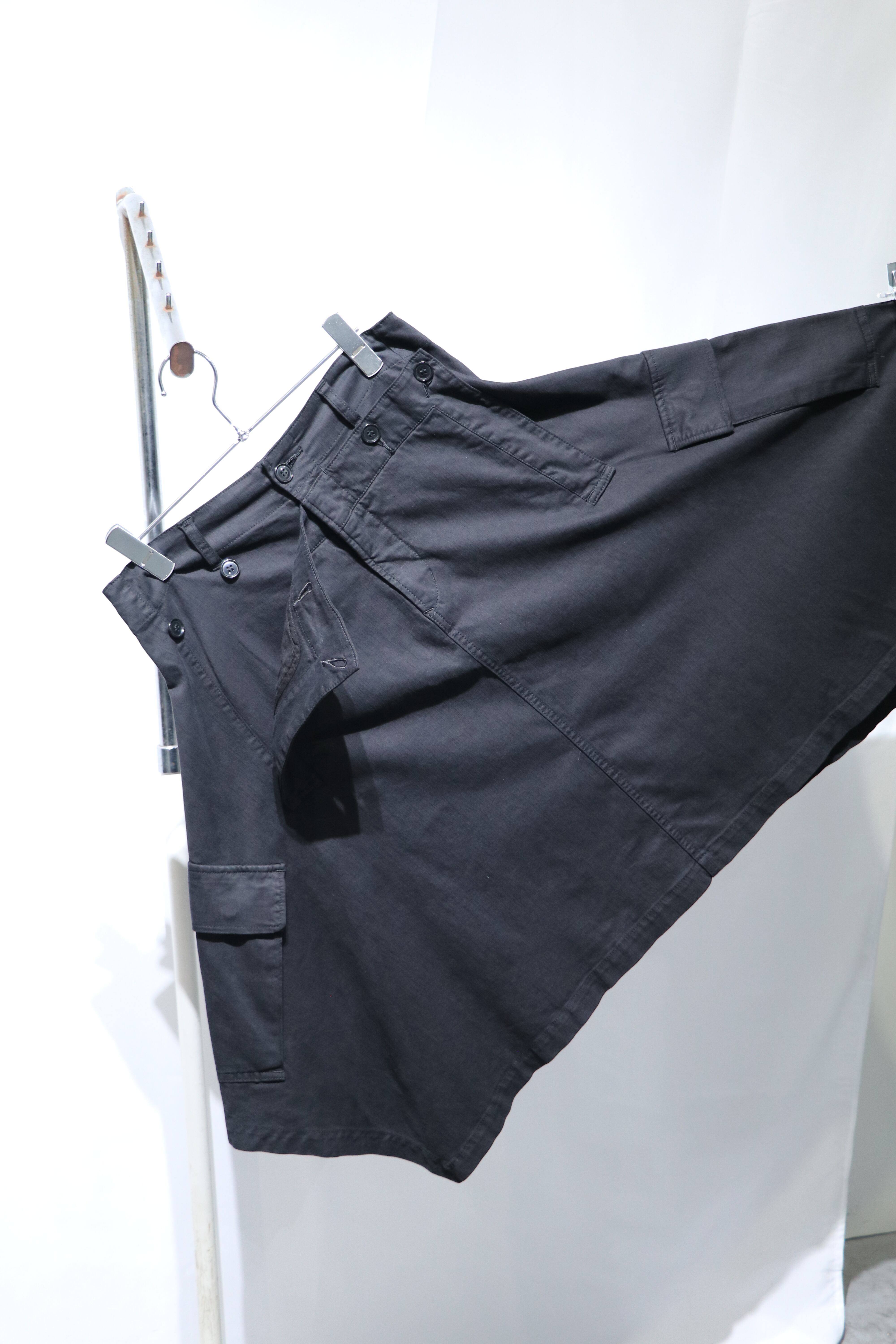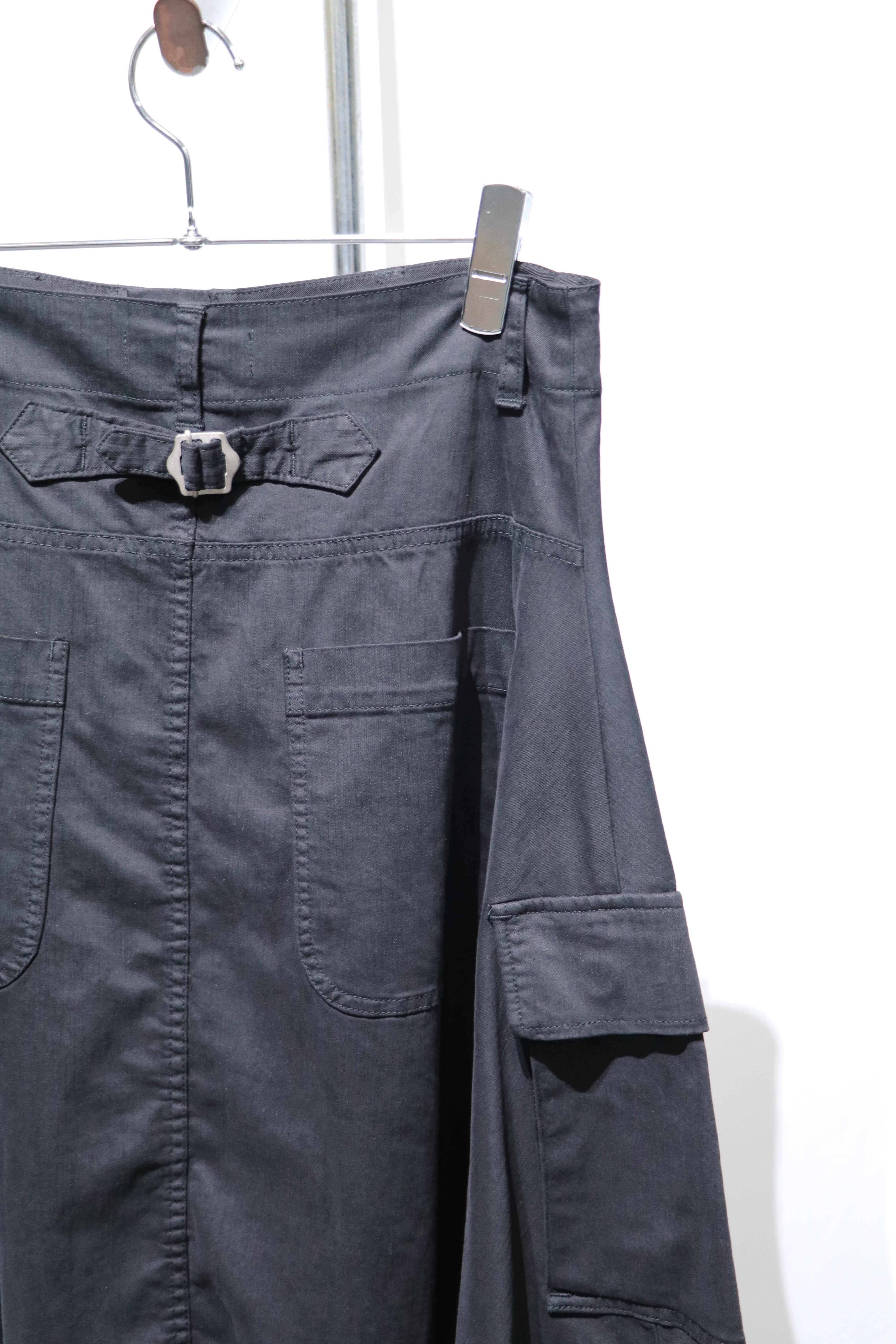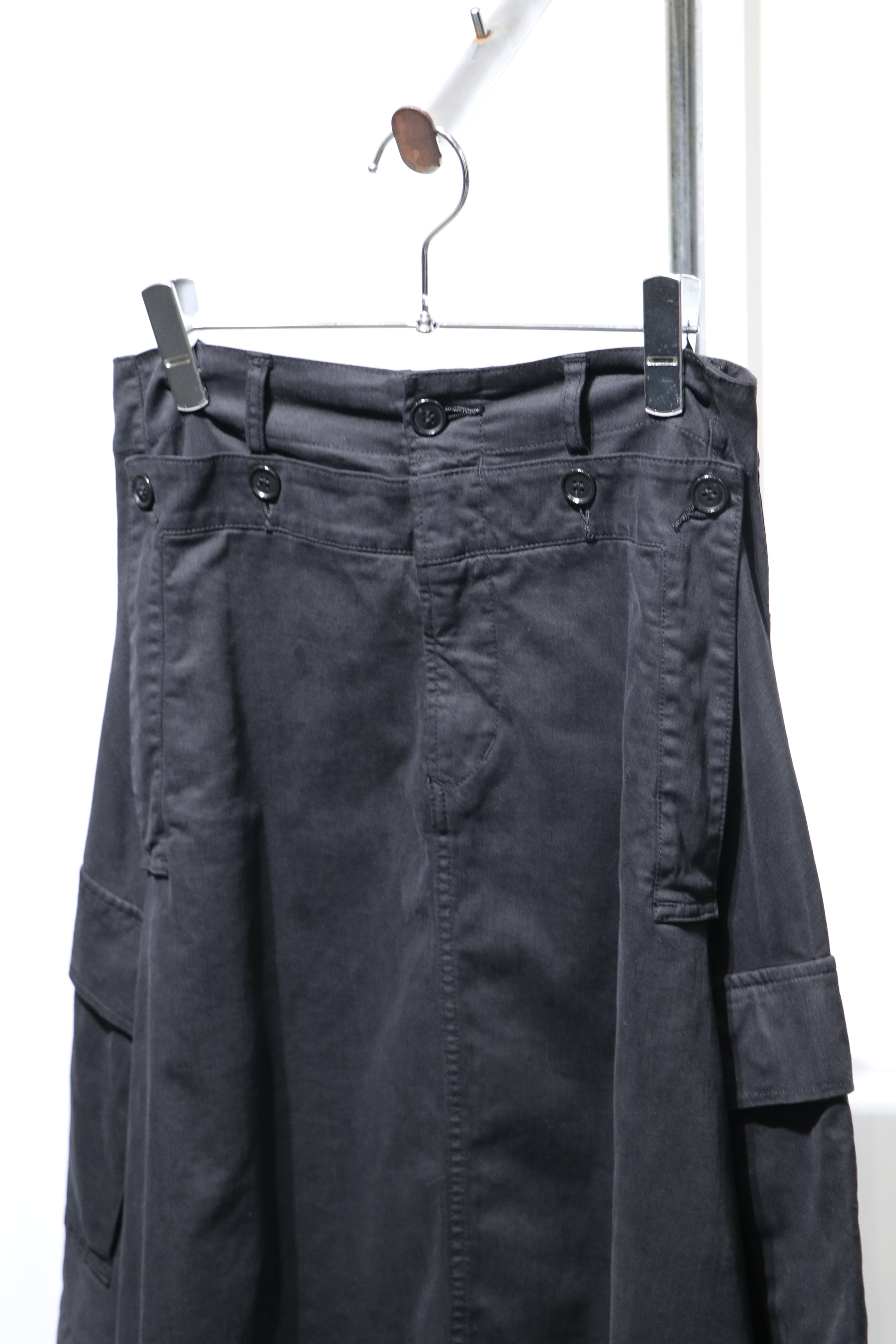 スーパーワイドなミドル丈のスカート。カーゴポケットにセーラー風のウエストデザイン。女性はもちろん男性にパンツとのレイヤードを楽しんでいただきたい1着。