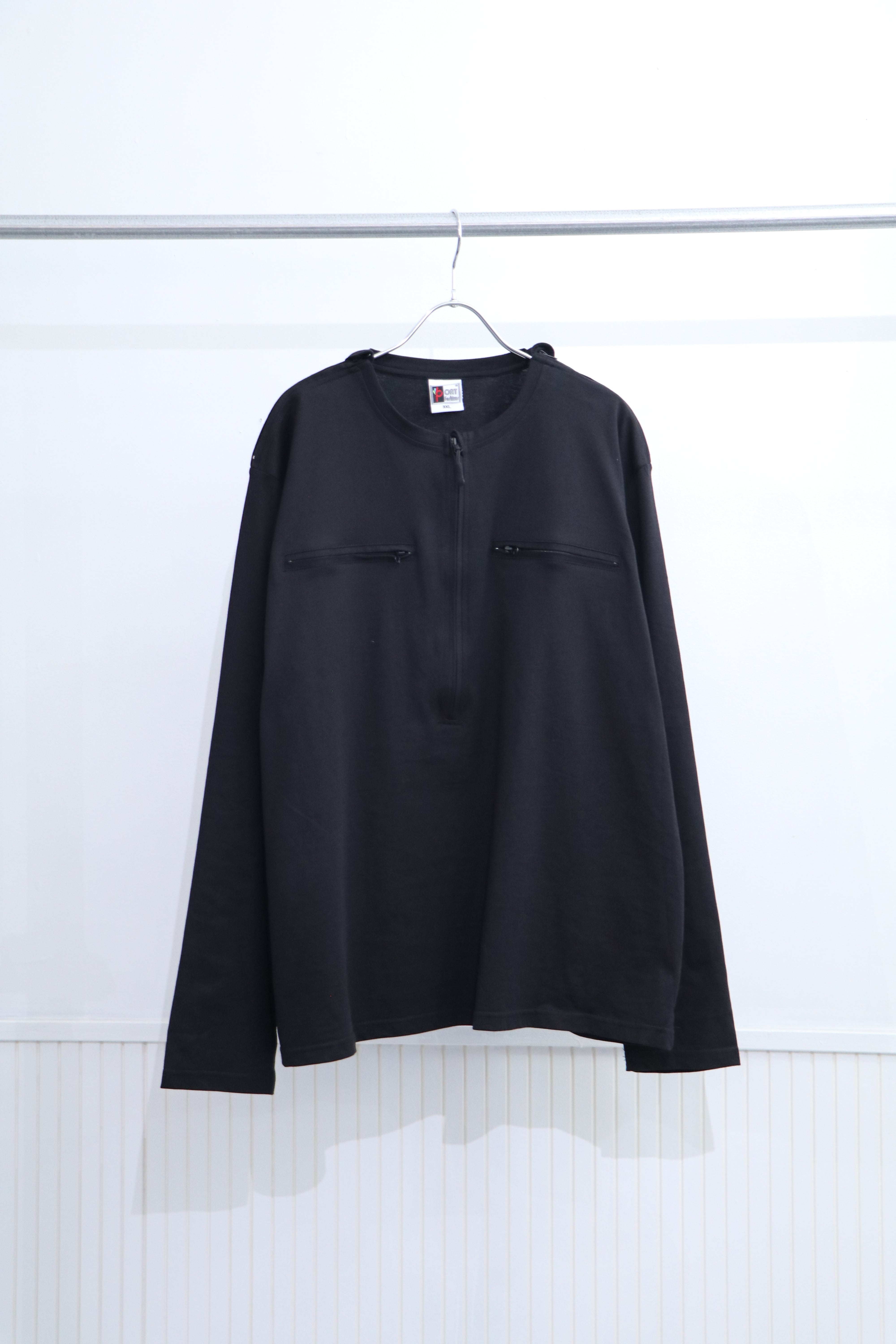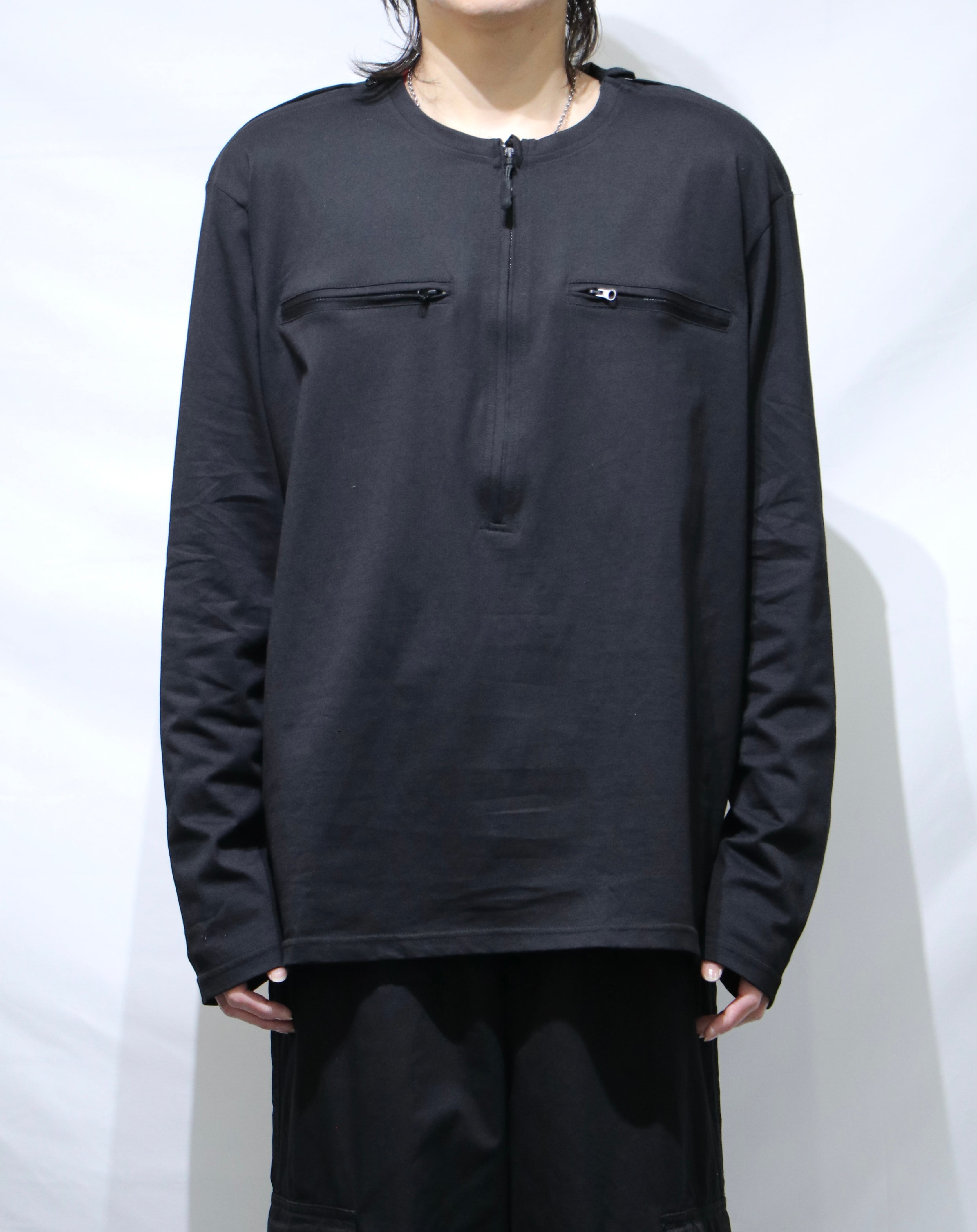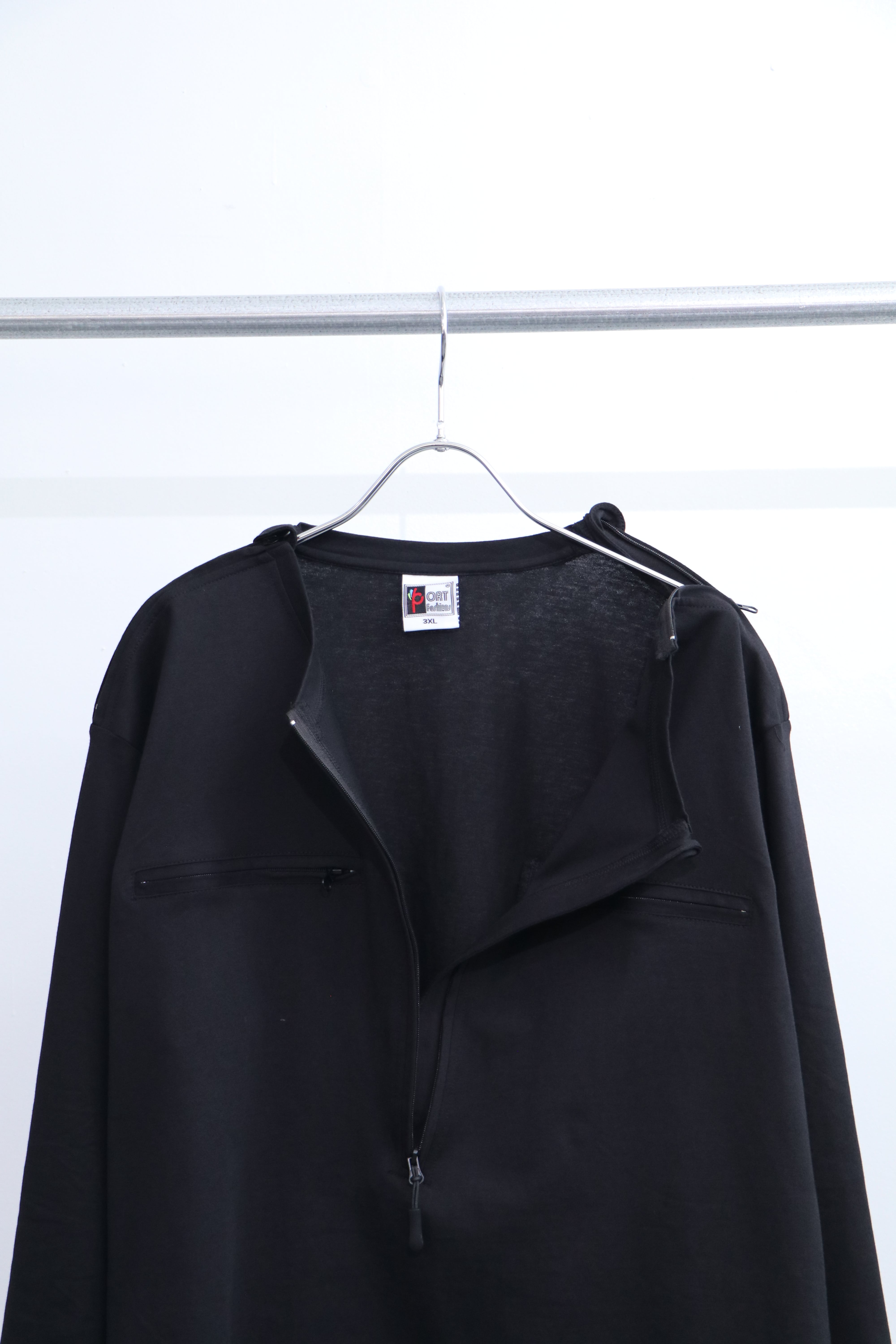 前見頃半分まで落ちるジップに、胸+肩にもジップ。
