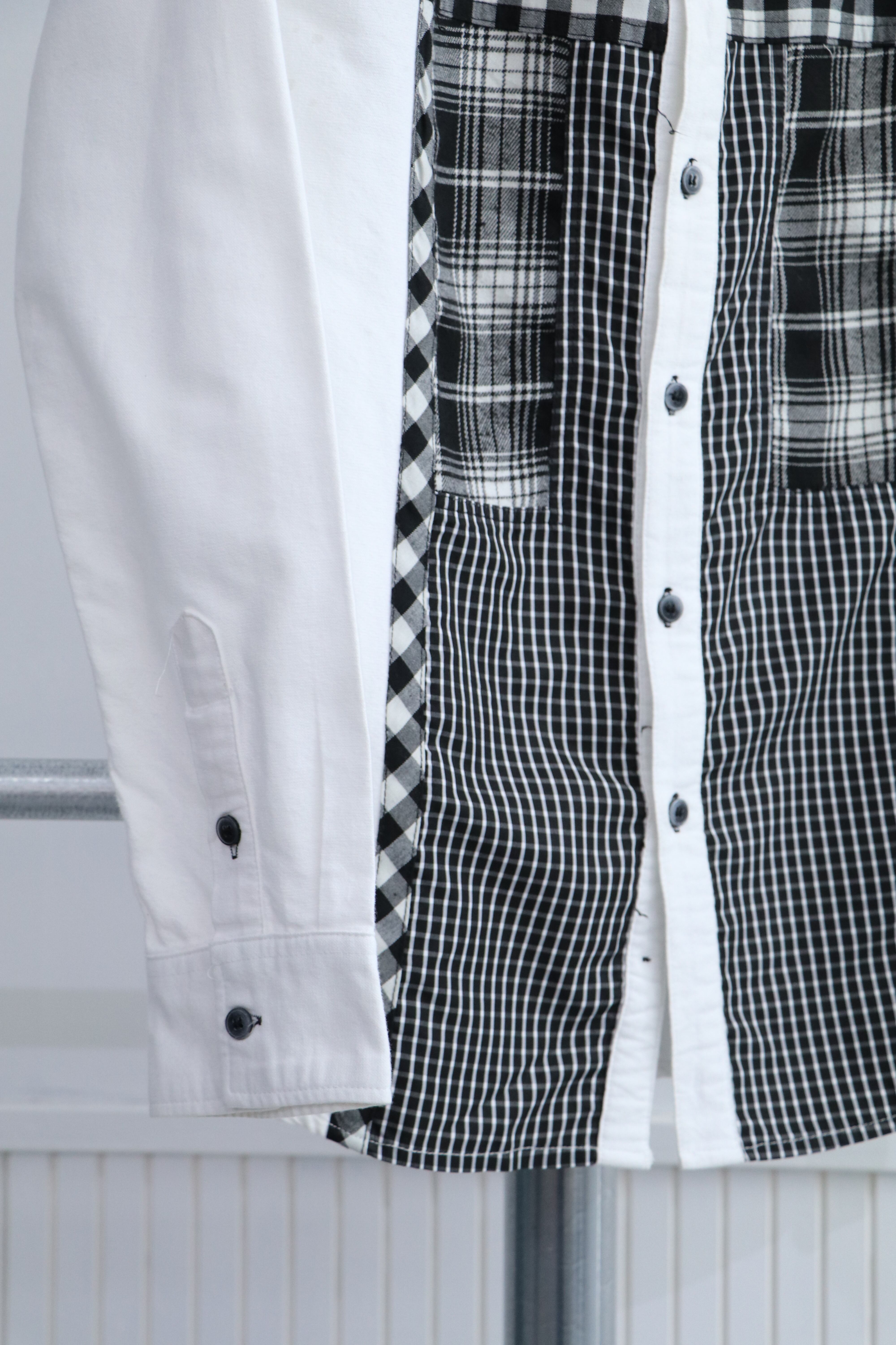様々な大きさのチェック柄がドッキングされた厚手コットンシャツ。